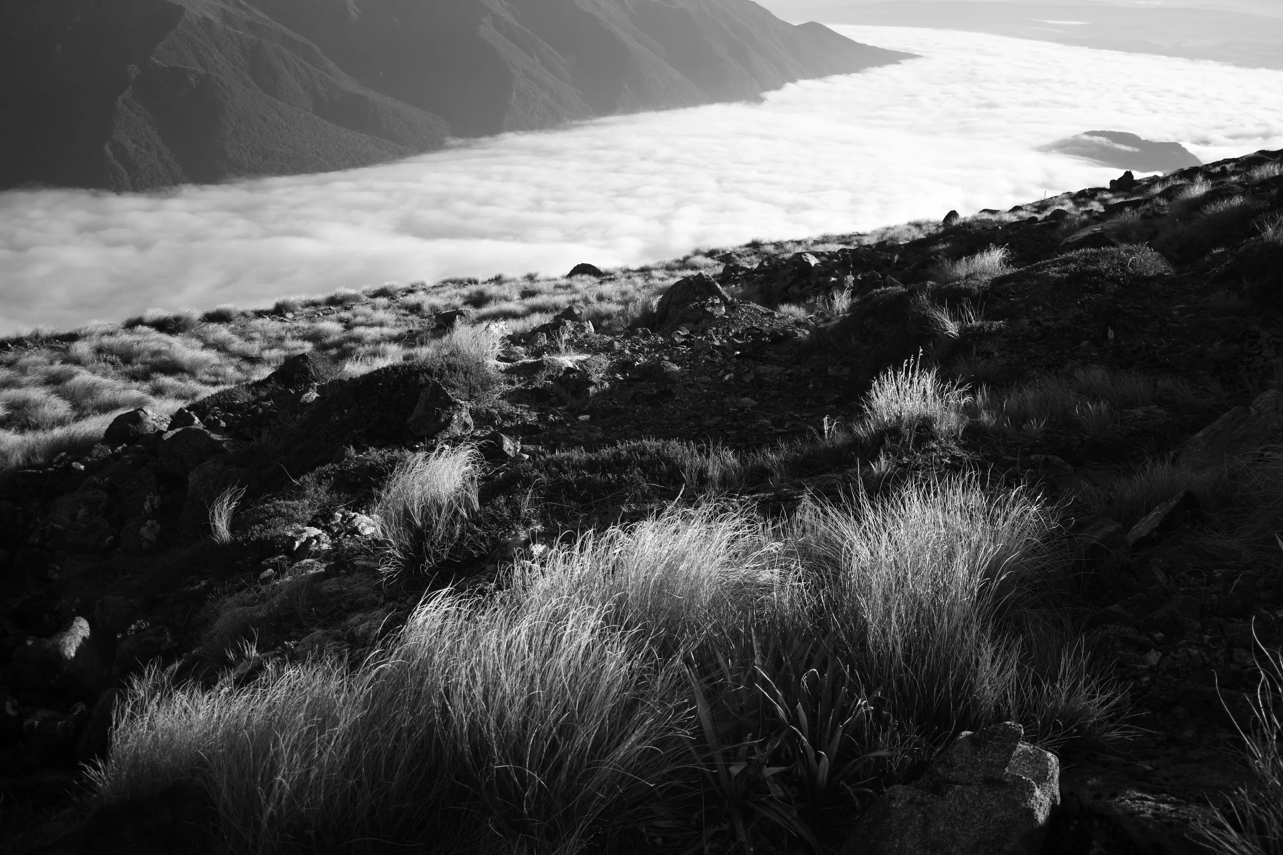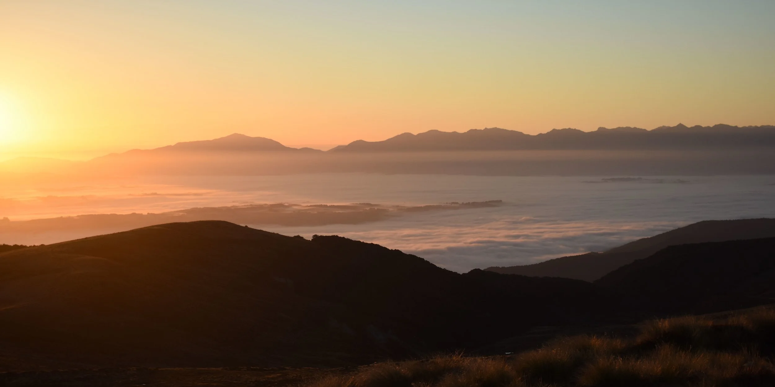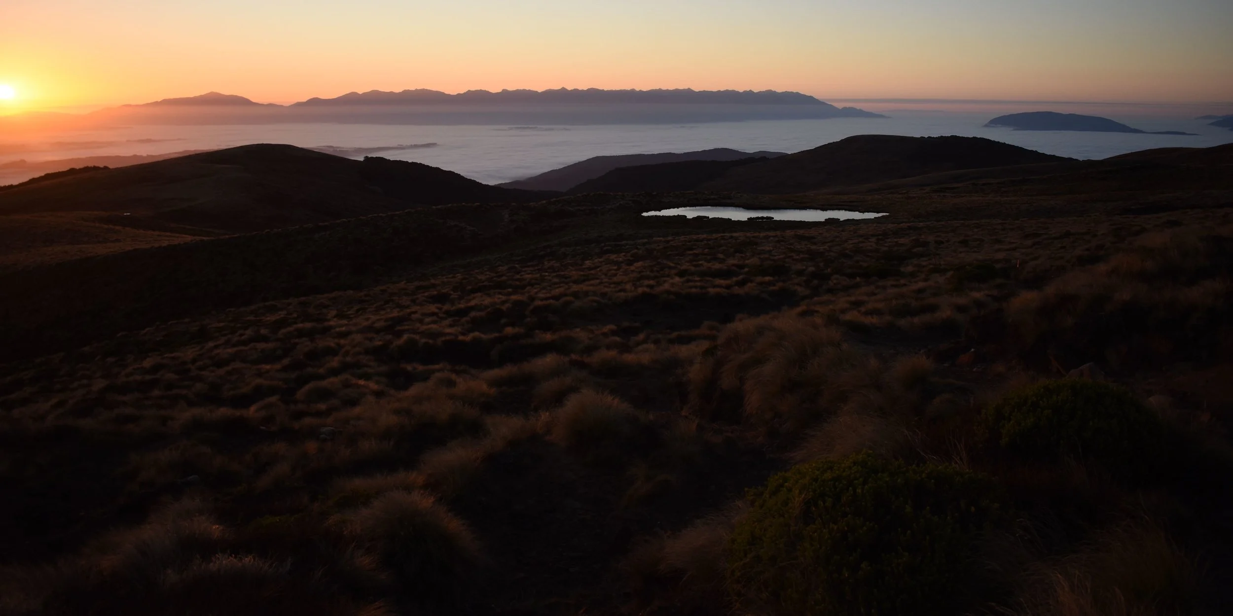 This days walk was to be almost entirely on the ridge line of the mountain, with no shade and no water sources. I guess NZ has a decent sized hole in the ozone layer above them, so the sun also always feels an extra bit intense too. With this in mind, I decided to start out with the twilight just before 6am. The lake and countryside below was completely covered in low clouds, making the hike feel all the more mysterious in the morning. The view as the sun rose above the clouds was so gorgeous I put my headphones on and actually danced up that mountain. Carefully danced up, i should say, as it would have been quite a long tumble off of the track if I lost my footing.