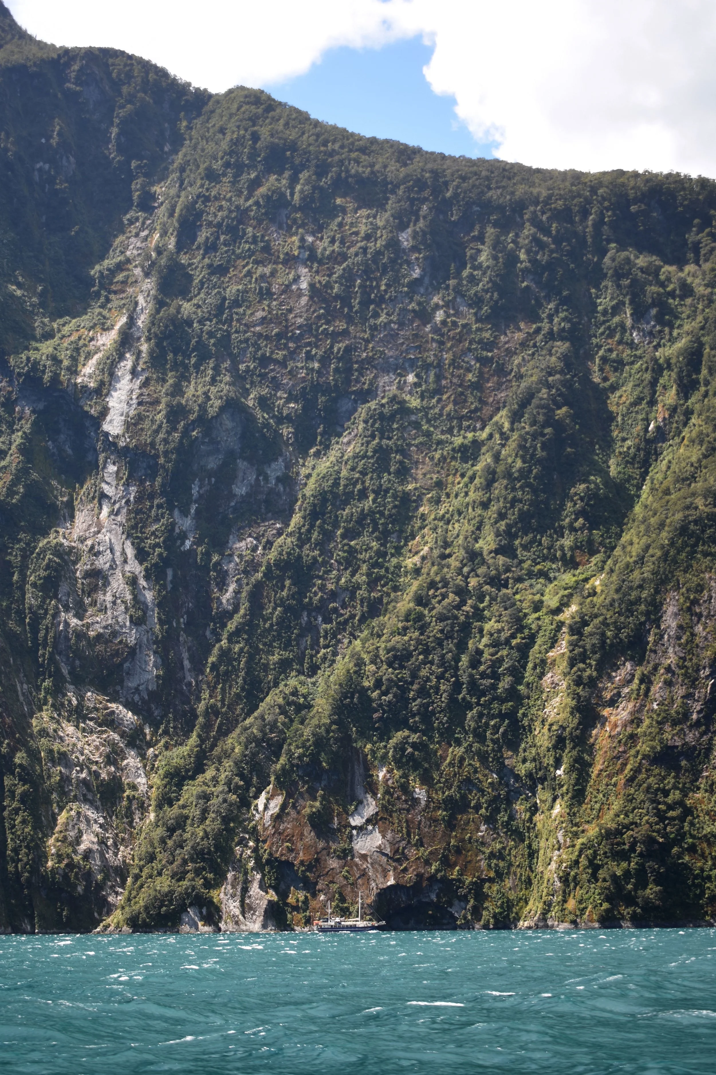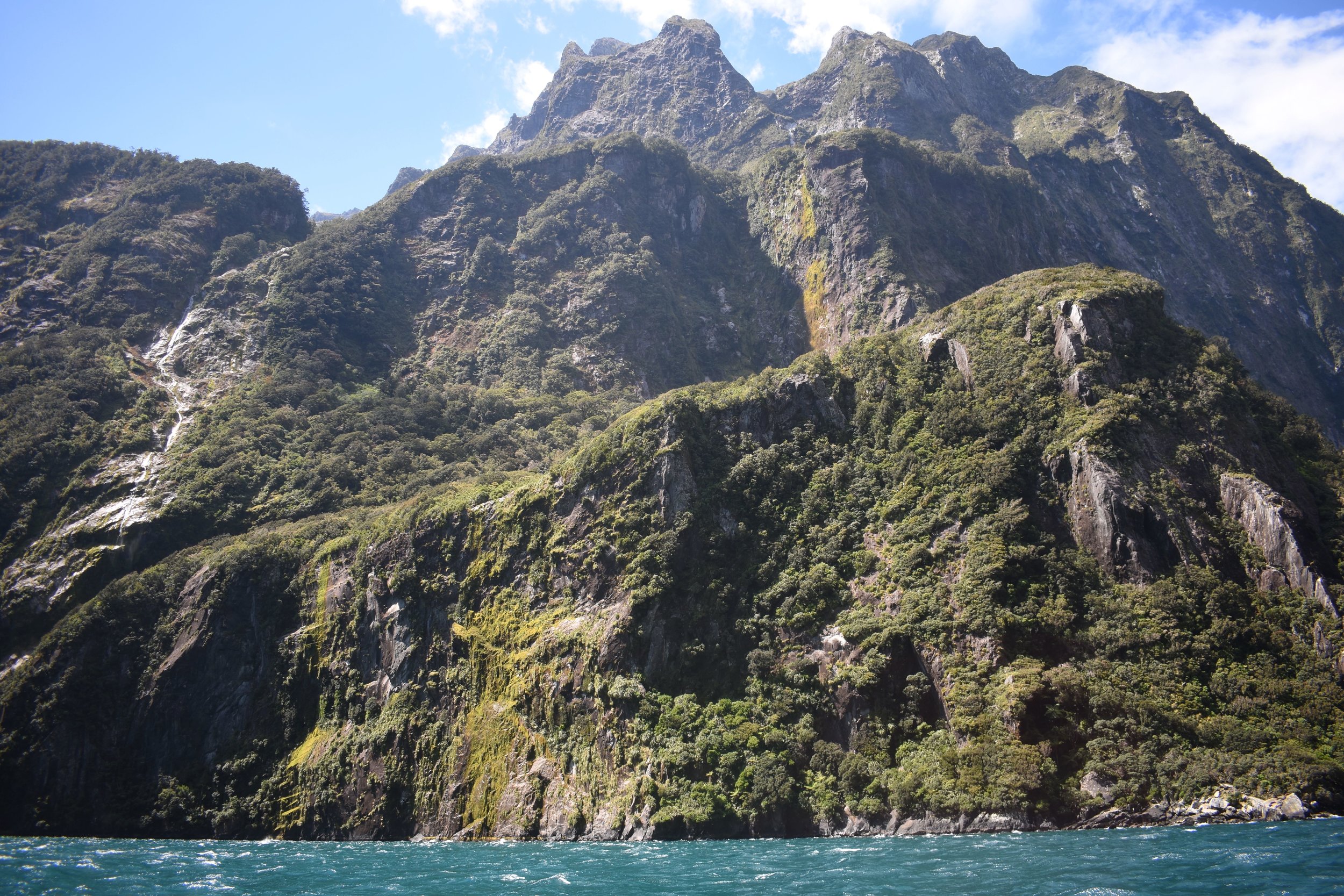 For the next days kayak trip, seven of us joined a guide in four double sea kayaks. Because the wind gets so intense in the afternoon, they take you out to beyond the mouth of the sound in the Tasman sea by a small boat. From there we hugged the cliff walls and kayaked all the way back to the dock. By the time we started kayaking most of the little cruise ships had finished their routes and for the most part we had the place to ourselves.